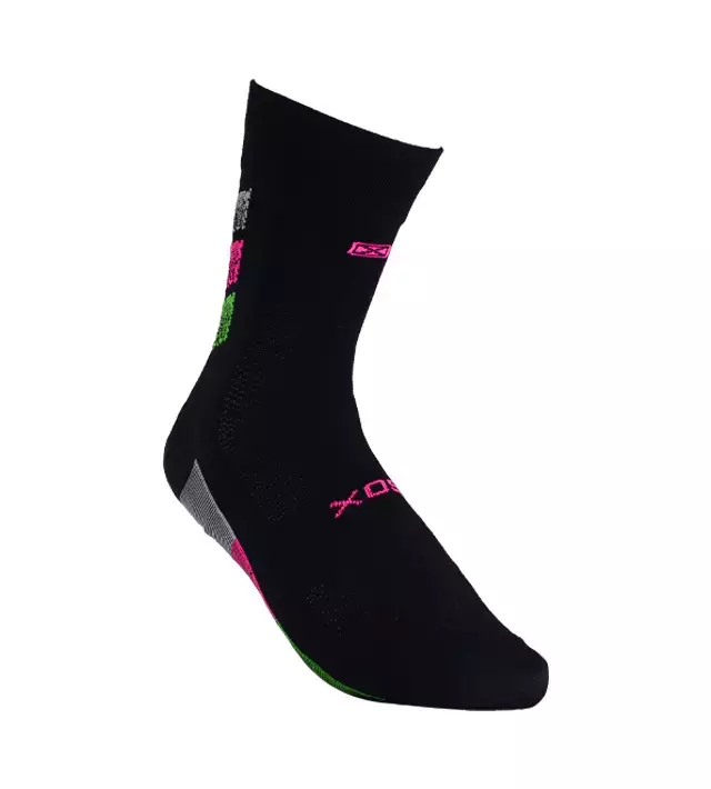 Puño doble elastizado, tejido liso, banda elástica en el pie para mejor sujeción, zona de ventilación en caña y pie para mantenerlo seco. Costura de puntera extra plana, talón y puntera reforzados. Ajuste y calce perfectos gracias al agregado de spandex. Secado rápido gracias a su composición.